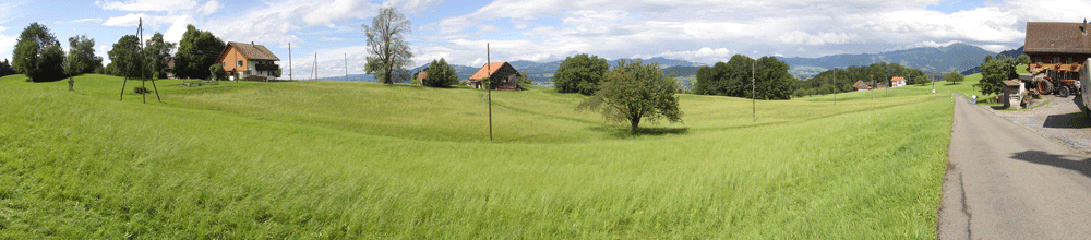 But let me introduce 'my farmer' to you. Even though this term represents a whole family, when we speak of 'the farmer' we really mean the Grandfather as the head of the clan. He must be around 70, a thinnish man of medium height, a little stooped perhaps, but still with dark and curly hair, a tiny golden cow in his left earlobe. In the early years it was Grandfather driving the tractor with Grandmother standing behind him and their daughter, Ottilia, sitting on the flat-bed truck. Sometimes, when he was alone, he would stop for a rest and treat me to a bit of his life. "I'm happy at home," he told me, breaking into a contented smile. "I don't go anywhere, not even to the Beiz. Once a year I go to the farmer's market in Uznach, about 15 kilometres away, and that's enough." But once, he wanted me to know, he had even been to Zurich, not to discover city life, mind you, but to change trains on his way to the Aargau area where he was serving his military duty. And yet he does enjoy my birthday cards with pictures of the New York skyline or the harbour in Shanghai. "As long as I don't have to go there," he keeps saying, a mischievous glint in his eyes.